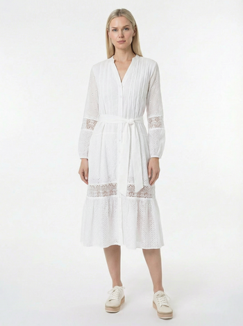 Delicate and breezy, this long-sleeve eyelet dress blends classic charm with modern ease. Lightweight eyelet fabric lends airy texture and subtle transparency, while a slight V-neck and button-down front create a soft, flattering opening. The removable waist tie lets you cinch the silhouette for definition or wear loose for relaxed movement. Long sleeves with gentle volume finish the look for effortless, day-to-night styling.