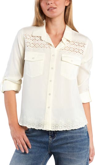 Enchanting stitching and lacy trim sweeten this swingy chambray shirt cut in a boxy fit and finished with classic button-up detailing.