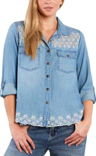 Enchanting stitching and lacy trim sweeten this swingy chambray shirt cut in a boxy fit and finished with classic button-up detailing.