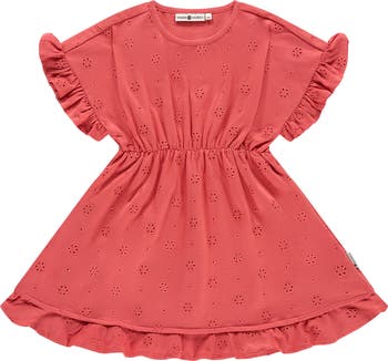 This faded strawberry-toned short sleeve dress features an allover eyelet detail, a cinched elastic waistband, and ruffled accents.