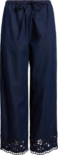 Made entirely of zero-stretch cotton denim, these pull-on pants feature an elasticized drawstring waist, relaxed straight legs and side-seam pockets. Elevated yet easy, this pair is finished at the hem with beautiful eyelet detailing.