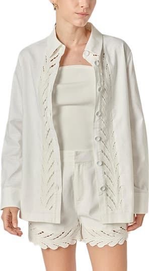 Airy eyelet embroidery trims the placket of this slouchy, oversized button-up made from a lightweight blend of linen and cotton.