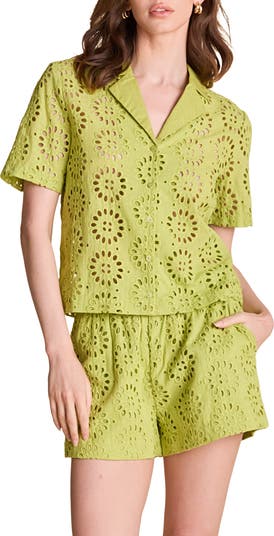 Make a retro-chic statement in this standout cotton camp shirt complete with airy eyelet embroidery.