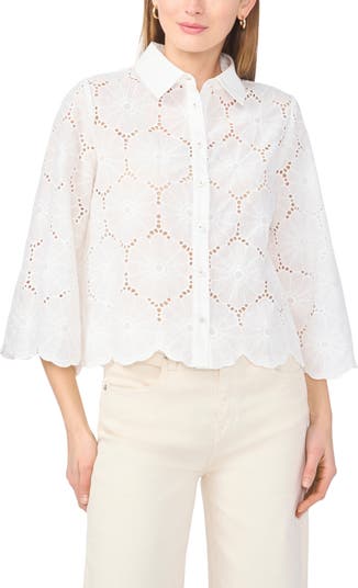 Flowery eyelet embroidery makes a vintage-chic statement on this woven cotton shirt that's a casual style standout.