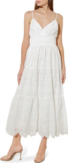 Stay effortlessly chic in this airy cotton sundress featuring eyelet embroidery and a scalloped hem.
