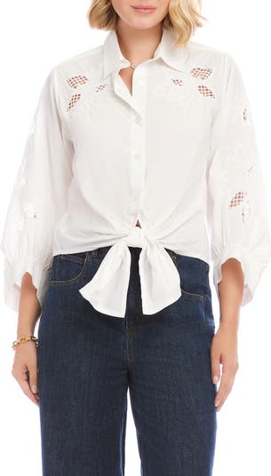 Flowery eyelet embroidery at the neckline and sleeves adds airy sophistication to this woven cotton shirt that ties at the front.