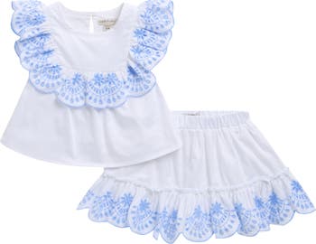 Pretty scalloped ruffles with eyelet embroidery sweetens this cotton set that pairs a peplum top with a matching skirt.