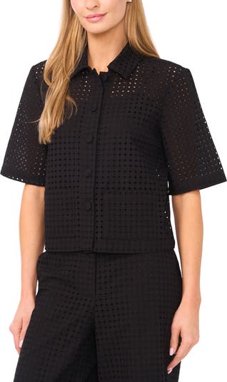 Eyelet embroidery adds subtle texture and modern sophistication to this button-front woven shirt topped with a crisp spread collar.