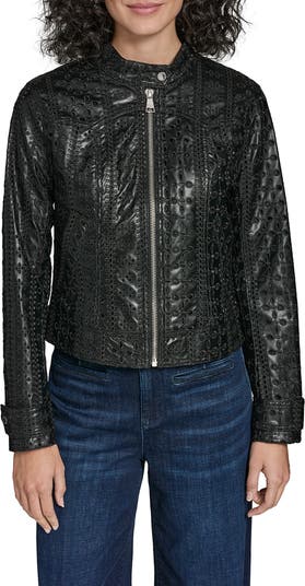 Swaggy faux leather dials up the dainty factor with delicate eyelet texturing the glossy surface.