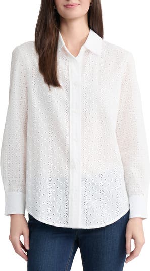 Airy embroidered eyelets enhance the texture and charm of this polished top cut from crisp poplin.