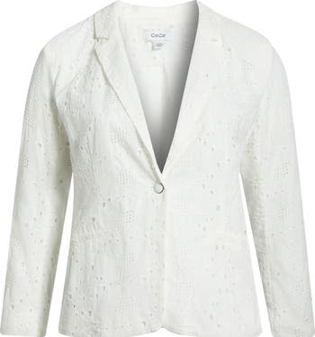 This eyelet lace blazer is cut from soft cotton and tailored with vertical seams for a flattering straight fit. It features classic notched lapels, front welt pockets and a single-button closure for an elevated, versatile finish.