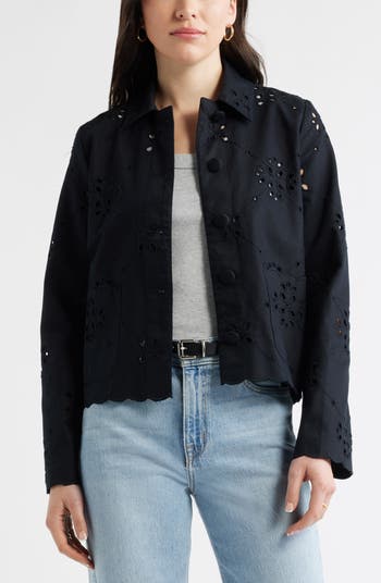 Cotton eyelet lace brings airy texture to this button-front jacket styled with a spread collar and scalloped trim. Covered buttons and front patch pockets add tailored detail, while the intricate lace keeps the look light and refined.
