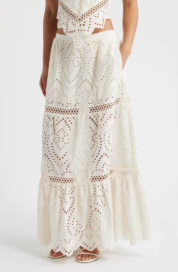 Soft cotton eyelet lace brings airy texture to this tiered maxi skirt designed for graceful movement. The tiered construction adds volume and dimension, while a scalloped hem provides a romantic finish.