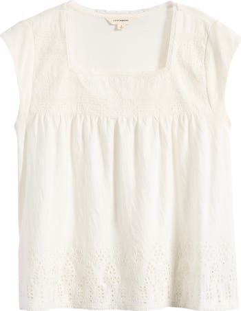 Breezy cotton and delicate eyelet lace bring airy charm to this cap-sleeve top. A square neckline frames the look, while tonal embroidery at the yoke and hem adds subtle texture and dimension.