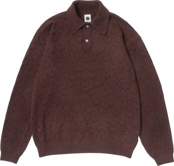- A knit longsleeve polo shirt, featuring a heart pattern created using fine wool yarn and eyelet knitting.