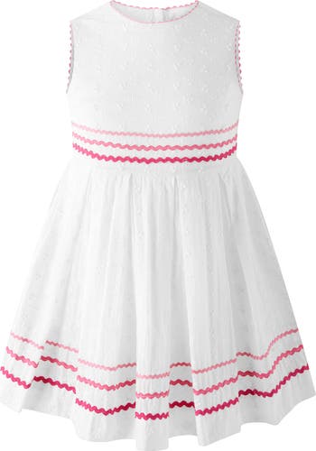 Crisp, classic, and beautifully detailed, the Eyelet Ric Rac Dress is a timeless warm-weather staple. Crafted in delicate white cotton eyelet, this heirloom-inspired silhouette is elevated with vibrant pink ric rac trim at the neckline, waist, and hem—adding a playful pop of color to a refined design.