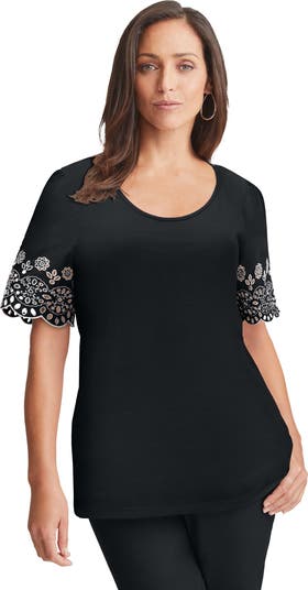 This everyday tee gets a polished makeover that features short sleeves with pretty eyelet details. Perfect for workweek outfits and casual weekend days, this top eases over all your favorite bottoms.