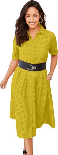 This effortlessly stylish eyelet dress features elbow-length sleeves with turnback cuffs, a full button-front placket and a shirt collar. Universally flattering fit-and-flare silhouette. Lined bodice.