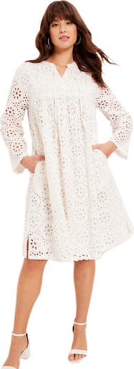 This lightweight eyelet dress features everything you want for effortless appeal: a slit neck style with ties. Lined.