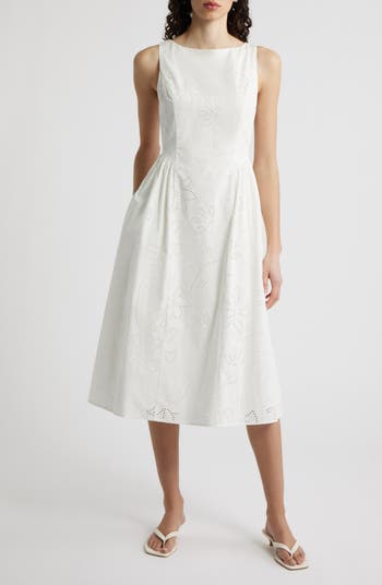 Swirling eyelets enhance the airy charm of this crisp cotton midi accented with a scooped back and a perfectly flared skirt.
