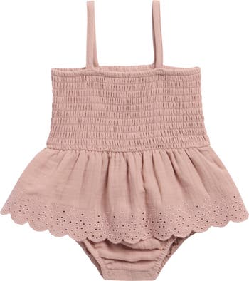 A smocked bodice and tonal eyelet details bring playful energy to this ultrasoft organic-cotton bodysuit made with a fluttery skirt.