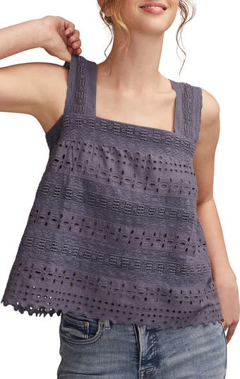 Embroidered eyelets bring breathable charm to this breezy cotton tank sweetened with lovely lace and scalloped trim.