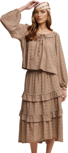 The Knit & Lounge Taupe Eyelet Tiered Skirt & Top Set offers a relaxed boho vibe with a touch of romance. Featuring a breezy peasant-style top with tie detail and a tiered ruffle midi skirt, this set is effortlessly feminine and perfect for everyday chic or weekend getaways.