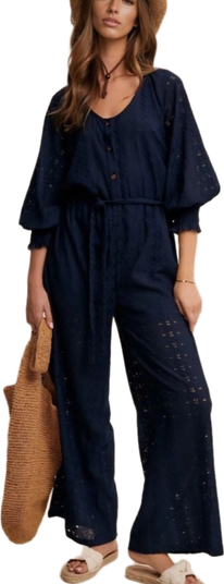 The Knit & Lounge Navy Eyelet Wide-Leg Jumpsuit is an effortless one-piece with a breezy, relaxed silhouette. Designed with a button-front bodice, tie waist, and cropped wide-leg cut, this piece is both chic and comfortable, making it a go-to choice for casual days or elevated evenings.