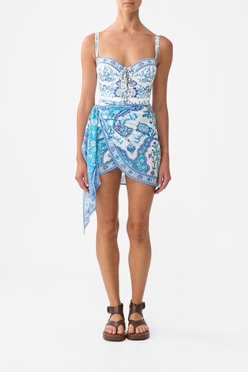 Inspired by the Topkapi Palace in Istanbul, the Iznik Lullaby Eyelet Wrap Mini Sarong With Tie Waist is a handcrafted silhouette designed by our in house artisans. Reimagined in an exclusive limited edition print, our mini sarong swim cover up features a wrap style that ties at the waist with eyelet trim detailing. Lightweight and effortless, the perfect layering piece for sun-drenched days and seaside moments.
