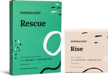 - Clean: 30 individually packaged Rise eyelid wipes, and 6 individually packaged Rescue hydrogel cold compresses.