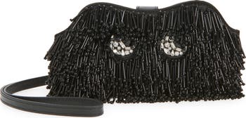 Crystal-embellished peepers keep a watchful eye on your specs in this beaded wristlet that also offers storage for your essential cards.