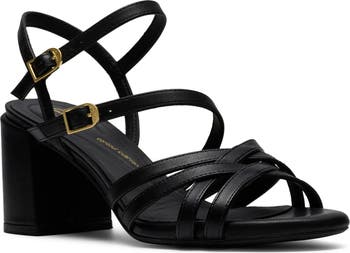Slender leather straps cross atop a chic sandal lofted by a chunky block heel.