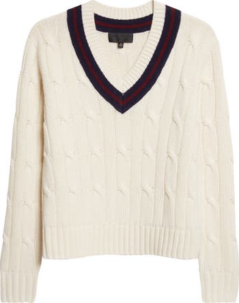 A classic tennis silhouette gets a heritage update in this cable-knit V-neck sweater knit from soft lambswool. Contrast stripes trace the neckline for a sporty pop, while ribbed trim keeps the fit clean and timeless.