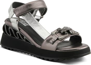 A gleaming bit and metallic straps bring boardwalk-ready style to a walkable wedge sandal boasting wave-textured cushioning and a grippy sawtooth sole.