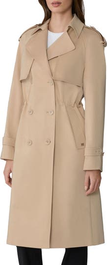 Freshen up your classic look with this streamlined trench coat completed in a soft, neutral hue that offers versatile wear with casual and dressier outfits.