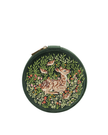 Join us in admiration of our latest collaboration with Chloe Giordano, the skilled freehand embroidery artist from North Yorkshire, whose intricate designs harmonise seamlessly with Fable's nature-inspired woodland tales. Behold the irresistibly adorable "Resting Fawn" design, a new addition that captured our hearts. Chloe graciously lent us this delightful image of love, now gracing our velvet jewellery box. Key features: Approx. 14 (L) x 14 (W) x 8.6 (H) cm Outer: 100% Polyester; Inner: 100% Polyester Wipe clean with damp cloth