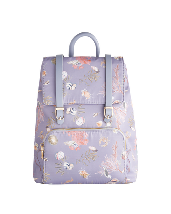 Our Powder Blue Mini Backpack from the Whispering Sands collection, designed by British artist Catherine Rowe, suits days that require a lighter load. Where ever you’re heading, this sweet shell design is bound to keep you wistfully wishing you were beside the sea. Featuring a front pocket, two inner pockets and an interior lend this bag suitable for everyday use. The stylish, buckled, alternative to leather straps and gold hardware add to the luxe charm of this style.