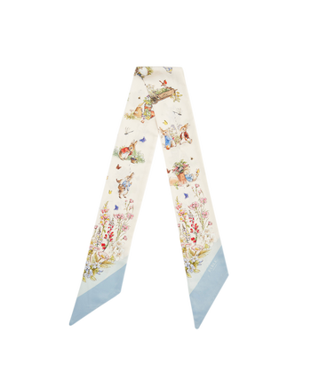Add elegance and storybook charm to your looks with the Fable England x Peter Rabbit Cream Skinny Scarf. Crafted in a soft, lightweight fabric, this refined accessory features delicate Peter Rabbit illustrations set against a classic cream background, finished with light blue trims. Perfect for the end of winter and into spring, it can be styled around the neck, tied to a bag, or worn in the hair for a subtle nod to nostalgic storytelling.