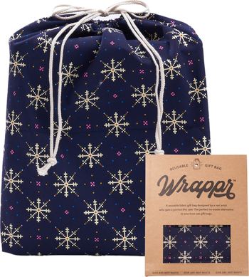 Reusable fabric gift bag designed by artist Kelsey Weigl and printed on cotton canvas. These fabric bags are the perfect zero-waste alternative to traditional one-time use gift bags. Designed by artist Kelsey Weigl and inspired by classic knitting patterns, The Fair Isle Collection gives a simple snowflake a fresh, modern twist with bold geometric shapes and colours. Designed for mixing and matching, this collection weaves together timeless charm with modern festiveness, celebrating the artistry of fair isle. Printed on cotton canvas with water based ink. Dimensions are 20" x 22" or 50 cm. x 55 cm.