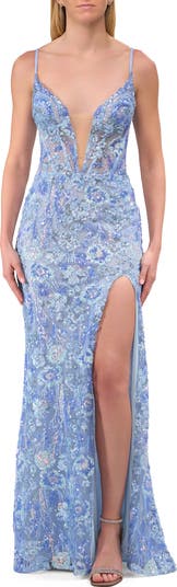 Amazing print sequin dress with a beautiful floral detailing throughout the fabric. The top features a deep V and the back has exposed boning. Back zipper closure.