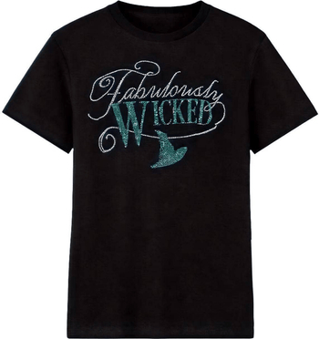 Black short-sleeve tee featuring the phrase “Fabulously Wicked” in bold, teal crystal embellishments. Detailed with a sparkling witch hat motif, adding a magical and playful twist. Relaxed silhouette crafted for both comfort and standout style. Easy to dress up with a statement skirt or down with denim for everyday chic.