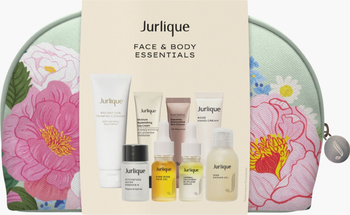 A travel-ready collection of face and body essentials designed to cleanse, hydrate and comfort skin from head to toe, presented in a floral cosmetic bag.