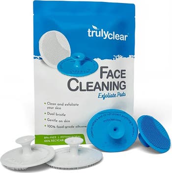 TRULY CLEAR: EXFOLIATE PADS - 4 Pack - Perfect for facial cleansing, blackhead removal, exfoliation and massage, this multi-use scrubber soothes skin and alleviates redness caused by acne. Dual Bristle: Lengthened bristles effectively remove dead skin, improve back acne, and leave your skin feeling revitalized. Clean and exfoliate your skill. Improve your skin's absorption of face products by removing dead skin. Embrace on-the-go skincare without compromising quality. It's perfect for women, men & everyone in between. Elevate your skincare routine by combining it with our One Step Acne Solution Bar for truly superior results. The 4 pack makes it easy to keep one wherever you need it - home shower, bathroom sink, gym bag, travel suitcase. HIGHLIGHTS: Dual bristle, gentle on skin, silicone, BPA free, Antimicrobial, 100% recyclable, vegan, Reusable, 100% Food-grade Silicone Facial Scrubber, Gentle Exfoliator for Sensitive Skin, Cleansing Brush, Soft Bristles, Removes Blackheads, Whiteheads - 2xBlue 2xWhite (4 Pack). Our hope is that everyone can feel confident and accepted in their own skin, without acne, blemishes, and imperfections. TRULY CLEAR - a trusted blemish brand.