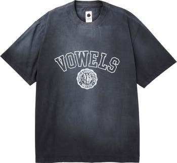 - Our box fit classic tee, garment dyed and treated for a vintage wash and appearance. Features a collegiate inspired graphic printed on the front, creating a durable and sturdy tee shirt with a timeless feel.