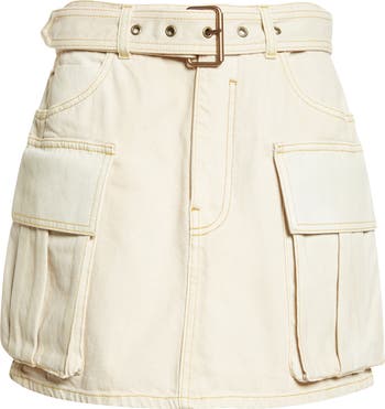 A belted miniskirt with cargo styling makes a utility-chic statement in bleached-out denim with the original blue wash ghosting through the topstitched seams.