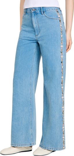 High-waisted, straight wide-leg jeans in faded cotton, embellished with rhinestone trim along the legs.