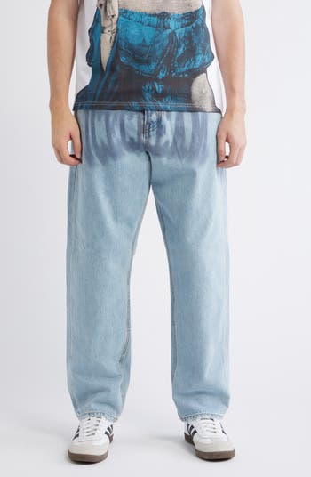 Foggy logo details float across the front of well-faded cotton jeans designed with a relaxed, roomy fit inspired by the easy-moving demands of Y2K skateboarding. They sit below the waist and stay wider in the legs to keep you comfortable whether you're rolling, relaxing, or ready to go out and have some fun.