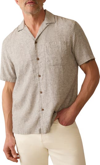 An allover palm print puts you in vacation mode in this durable yet soft linen-blend shirt that gets better with every wash.