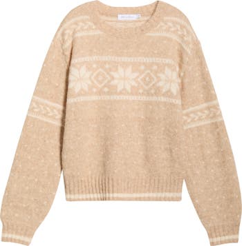 A snowy Fair Isle pattern strikes a perfect balance between cozy and contemporary on this soft crewneck sweater.