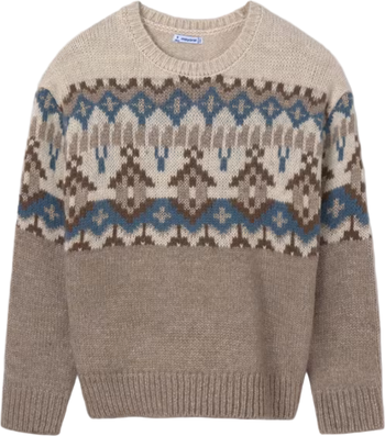 - Beige knit sweater with blue, brown, and white Fair Isle pattern